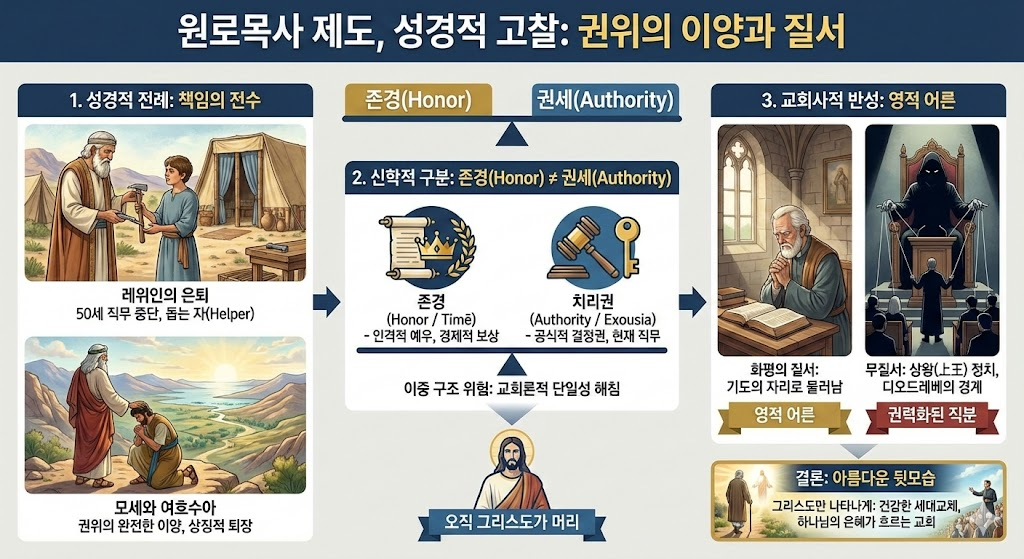 신학적 관점에서 원로목사 제도 자체가 악한 것은 아니다. 다만 그 목적이 마땅한 '존경'에서 '지배'와 '영향력 행사'로 변질될 때 문제가 발생한다. 성경이 제시하는 지도자의 참된 마지막은 자신의 흔적을 지우고 오직 그리스도만이 공동체 위에 높여지게 하는 것이다.